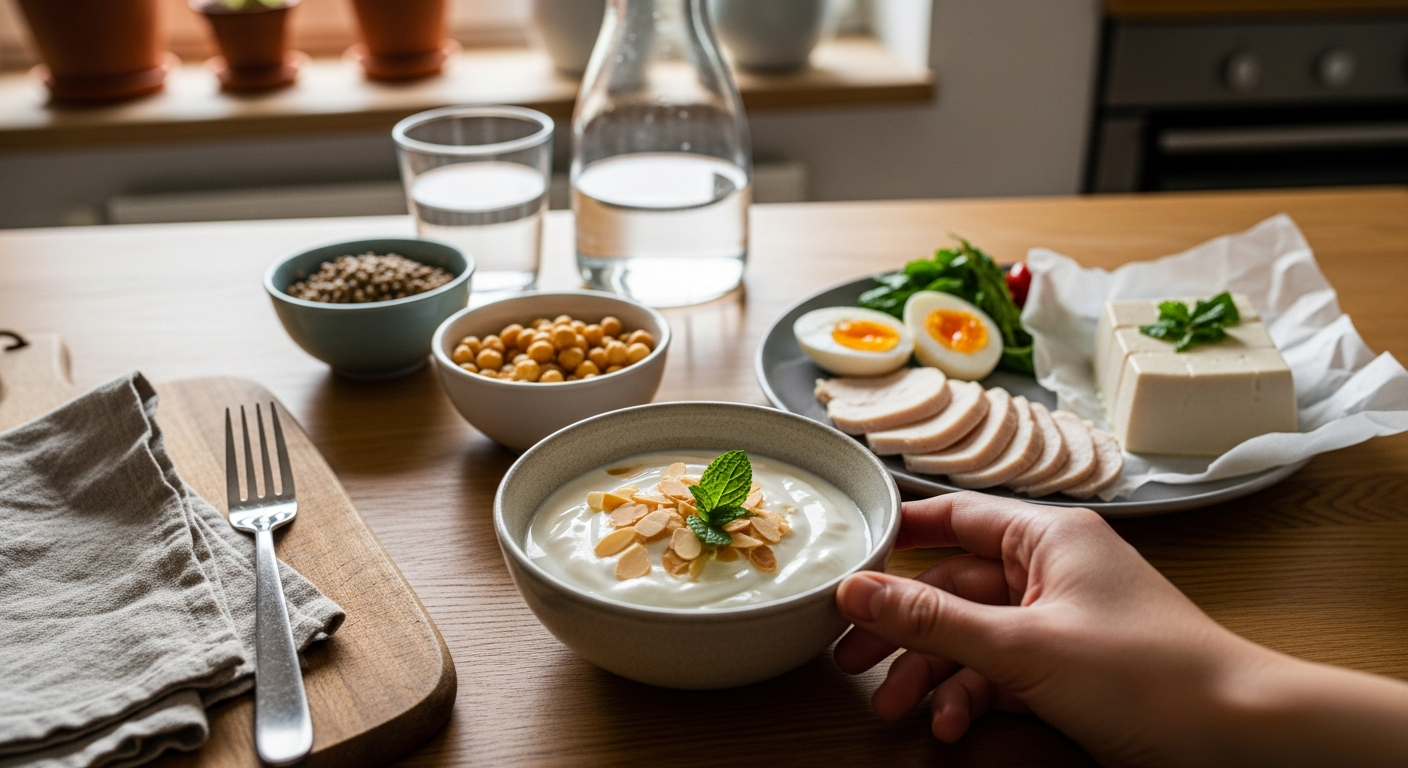 Ideal sind fettarme Optionen wie Hähnchenbrust, Magerquark, Linsen und Tofu, da sie bei wenig Kalorien sehr gut sättigen. Eine Mischung aus pflanzlichen und tierischen Quellen sorgt zudem für ein optimales Aminosäureprofil.